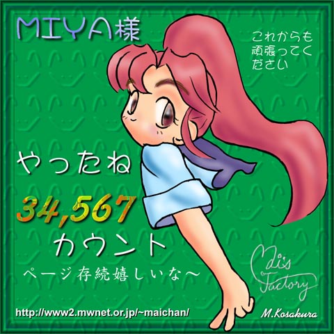 MIYAさん、ホームページ来訪者34、567人記念&ページ存続おめでとうございます。